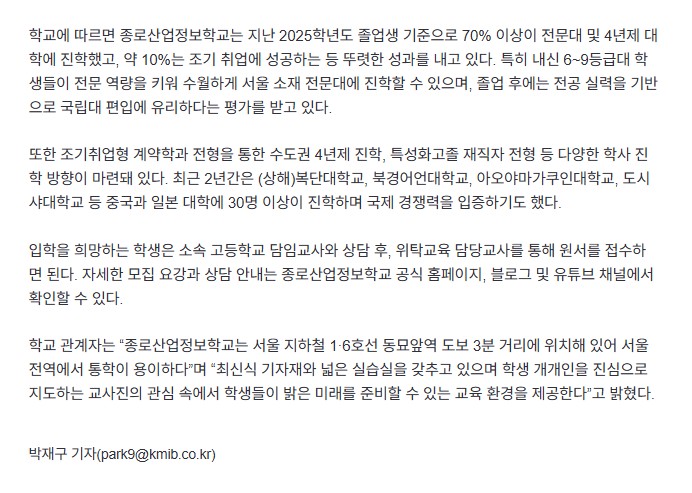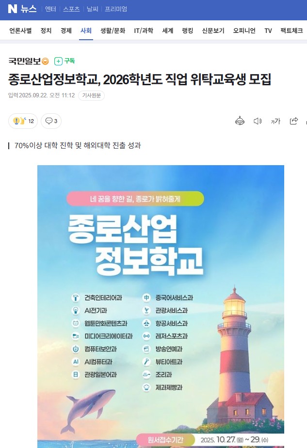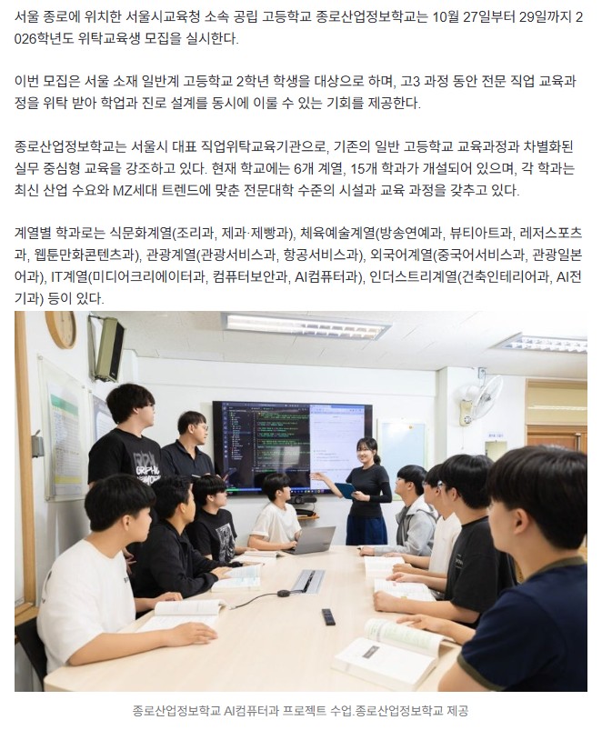 종로산업정보학교, 2026학년도 직업 위탁교육생 정시모집 네이버뉴스 기사