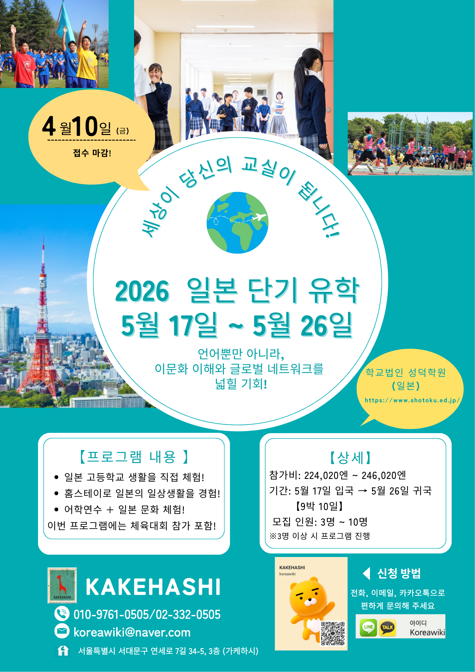 해외 교류 전문 기관인 '가케하시'에서 진행하는 2026년 일본 단기 유학 프로그램 소식을 전해드립니다. 이번 프로그램은 일본 도쿄 소재의 명문 사학인 성덕학원(쇼토쿠가쿠엔)과의 협업으로 진행되어, 현지 고등학생들과의 직접적인 교류가 가능하다고 합니다.