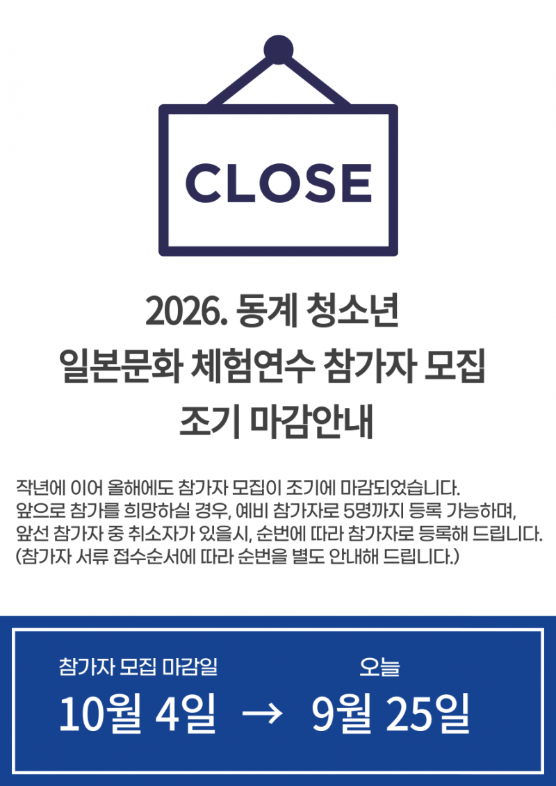동계 청소년 일본문화 체험연수가 작년에 이어 올해에도 조기마감되었습니다.