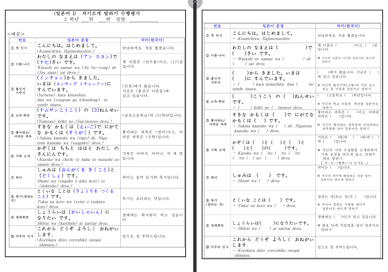 [참고] 일본어 자기소개 말하기 평가용 문장 (10개)