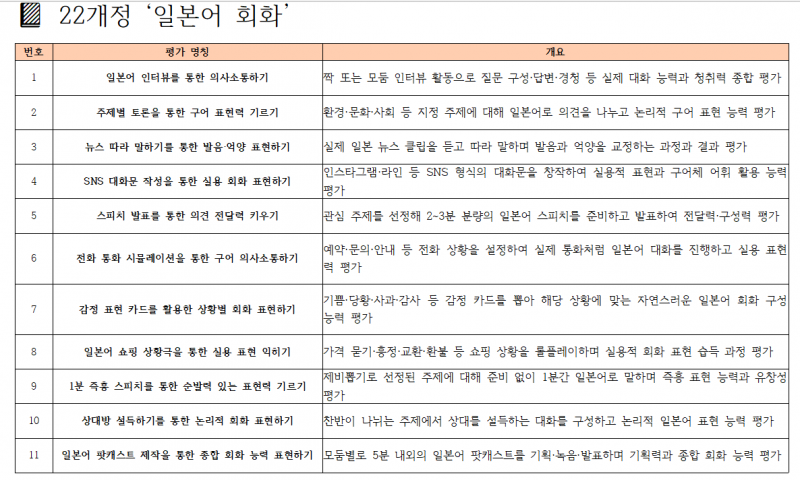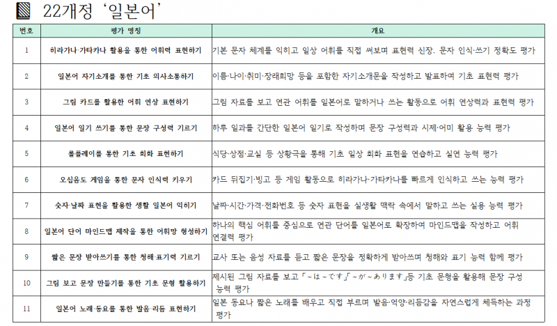 [참고] 22개정 '일본어', '일본문화', '일본어 회화' 의 과정형 수행평가 명칭 사례 및 평가개요.
