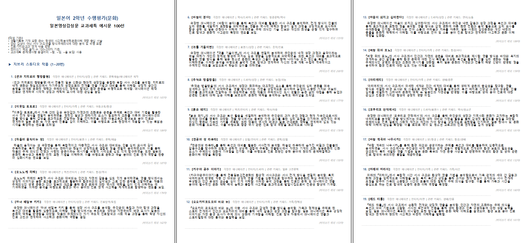 일본영상 [영화, 애니메이션, 드라마 등] 감상분석문쓰기 유형의 교과세특 예시 모음(100개)