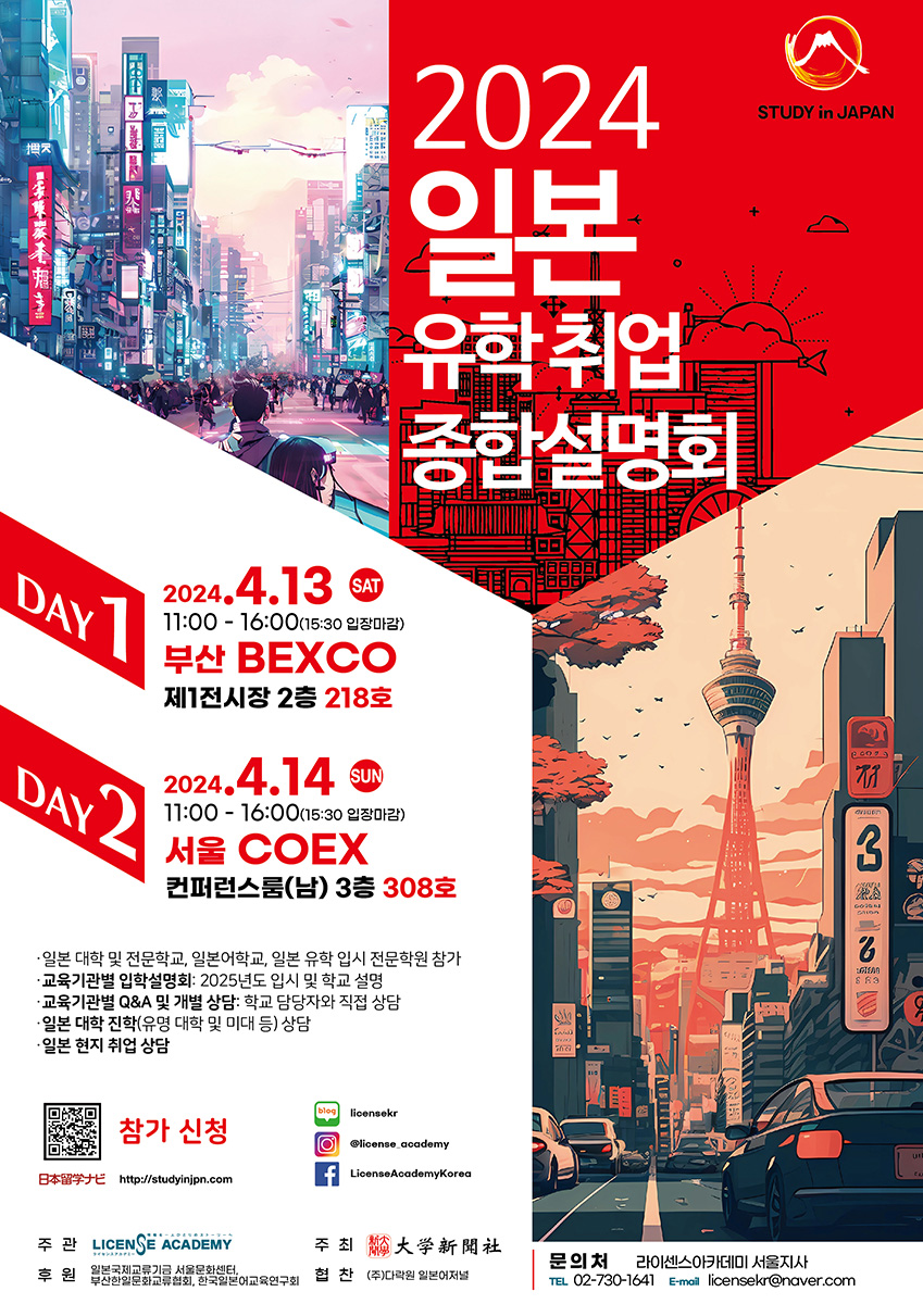 안녕하세요. 일본대학신문사가 주최하고 라이센스아카데미가 주관하는 [일본유학취업종합설명회]가 2024년 4월13일(토) ~14일(일) 양일간 부산과 서울에서 대면형식으로 개최됩니다.